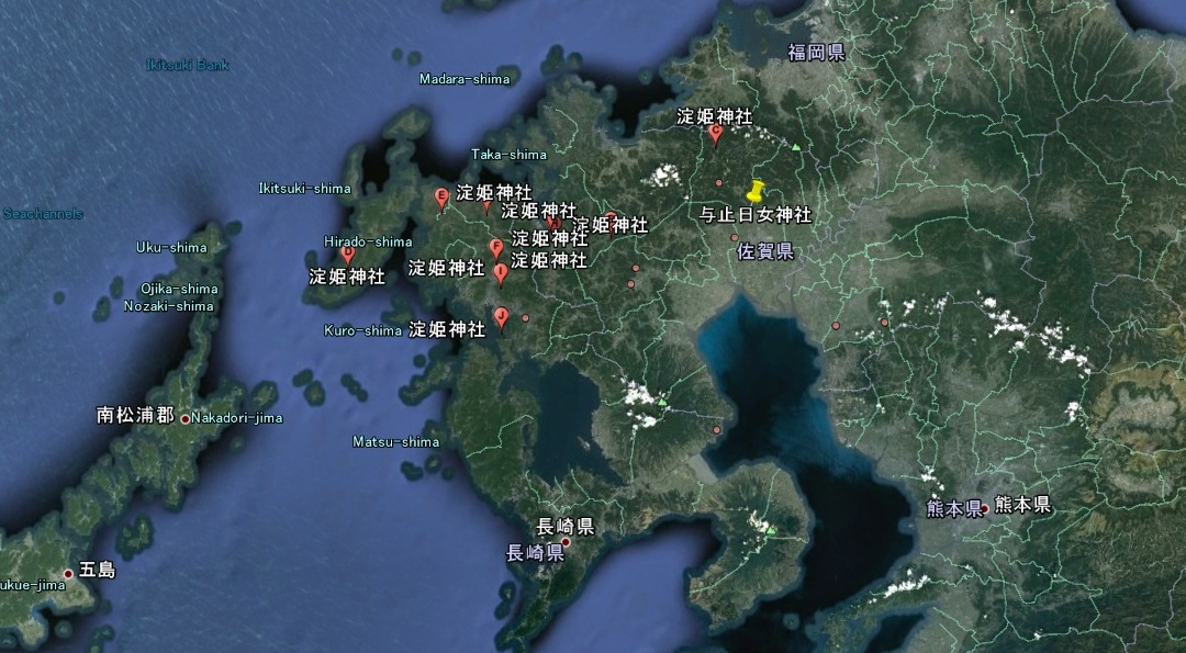「佐賀県を中心とした」といっても「淀姫神社」は長崎県北部にも多いです。「佐賀県を中心とした」という発想は、佐賀県の與止日女神社が肥前国の一宮だったからでしょう…。